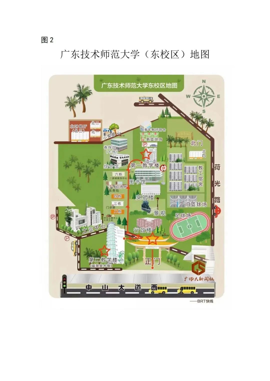 2024年全国联招入学考试将于5月18、19日进行,本次考试广州考区设立3个考点,具体安排如下:1.全部香港考生(理工类),安排在广东工业大学(大学城校区)考点考试,地址:广州市番禺大学城广东工业大学(大学城校区)广工一路(教学区东门入口),考场位于教学二号楼(具体位置见图1),联系电话:020-39322665。2.香港考生(文史类,考生号040110002-040112016),安排在广东技术师范大学(东校区)考点考试,地址:广州市天河区中山大道西293号,考场位于第一、二教学楼(具体位置见图2),联系电话:020-38265603。3.香港考生(文史类,考生号040112017-040113138),全部澳门、台湾及华侨考生,安排在暨南大学(石牌校区)考点考试,地址:广州市天河区黄埔大道西601号,考场位于主教学楼(具体位置见图3),联系电话:020-85220130。